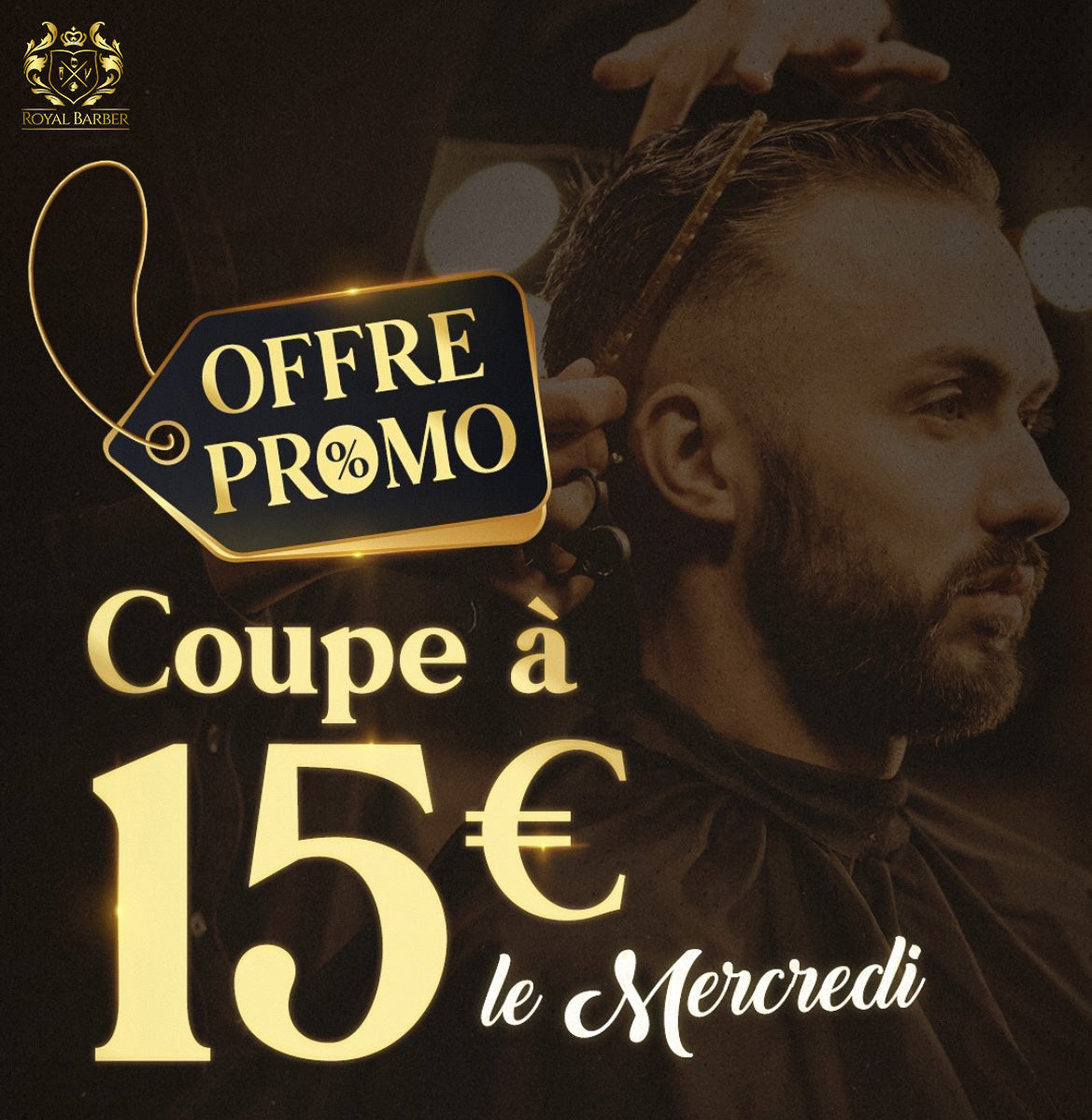 Chez Royal Barber, l’élégance reste accessible. Chaque mercredi, profitez de notre offre exclusive : la coupe à seulement 15€. Une occasion parfaite de rafraîchir votre style en milieu de semaine.